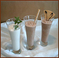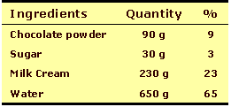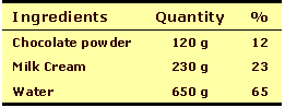 electric mixer to homogenize well. Result: Normally white chocolate ice drink needs more intensity, thus a higher proportion in the formula because it has less strong flavour than dark chocolate.