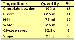 fondant: * To make glycose syrup: Heat in a saucepan 25.77 mL water with 16.25 g sugar and boil to obtain a transparent fluid. Cool and use in the fondant mixture.